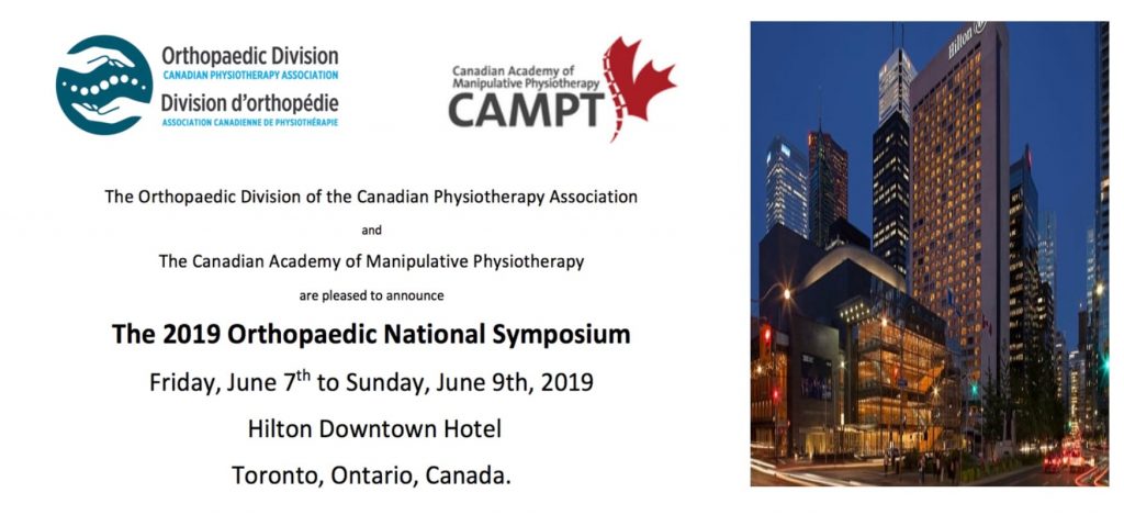 The 2019 Orthopaedic National Symposium is a national conference dedicated to orthopaedic physiotherapy practice in Canada and is being held as a partnership between the Orthopaedic Division of the Canadian Physiotherapy Association and the Canadian Academy of Manipulative Physiotherapy.